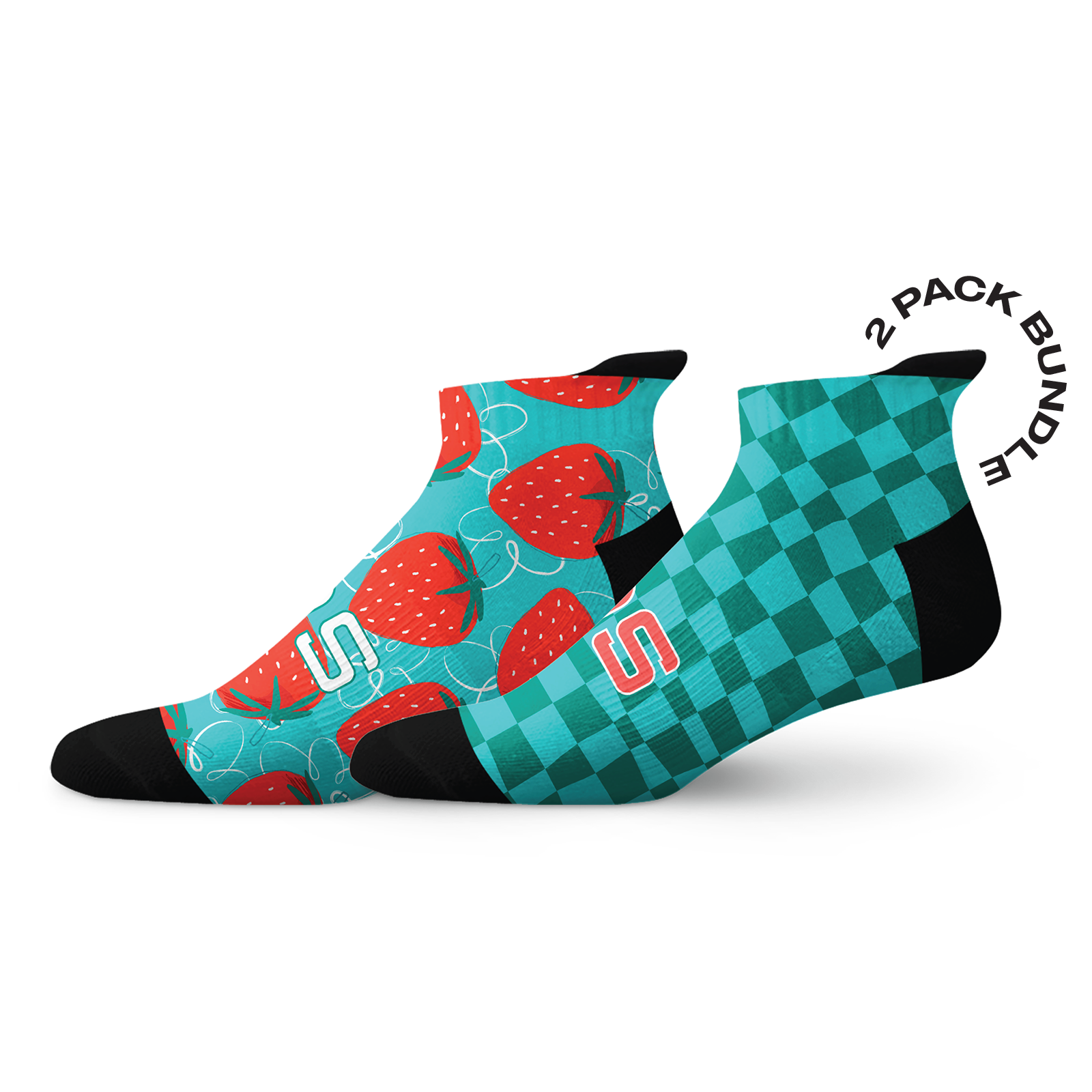Sweet meets street. The Berries Combo is your summer statement. One pair bursting with juicy red strawberries, the other rocking a bold teal checkerboard. Vibrant, playful, and performance-ready, these tab socks are designed to turn heads and power your pace.